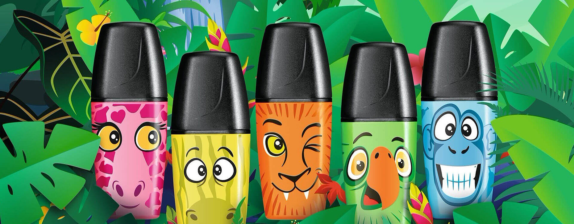 Welcome to the STABILO BOSS MINI Funnimals limited edition – a set of 5 funny and funky mini-highlighters. Perfect for everybody that is looking for the unusual. These pocket highlighters with the intriguing glow in the dark imprint will easily fit into a pocket, pencil case or handbag, and they also make a great gift idea!