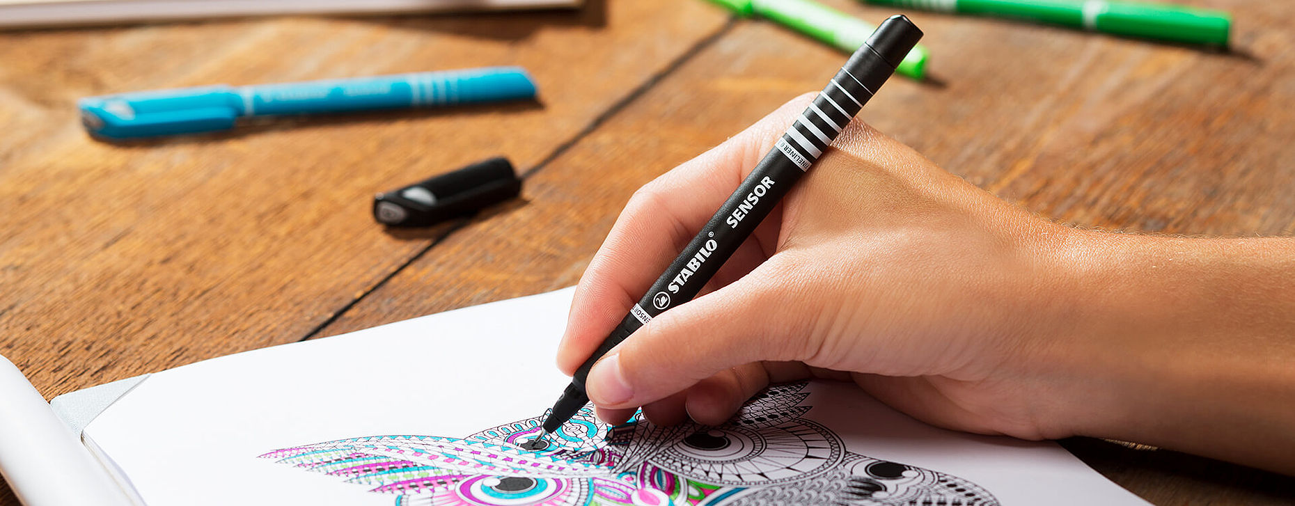 The STABILO SENSOR fineliner with cushioned tip provides a relaxed feeling whilst writing – the tip will not bend or break. It’s in a class of its own. It is well suited for the prolific writer as well as for the artistic type who likes to relax creatively by colortangling. It comes in 8 vibrant colors, a line width of 0.3mm and a modern design.